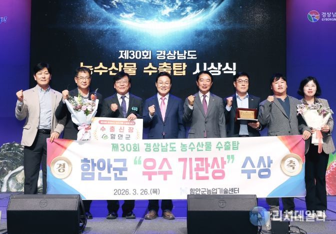 리치데일리 김상현 기자 | 함안군은 지난 26일 창원컨벤션센터에서 열린 ‘제30회 경남도 농수산물 수출탑 시상식’에서 우수 기관으로 선정돼 수출 신장상을 수상했다고 밝혔다.