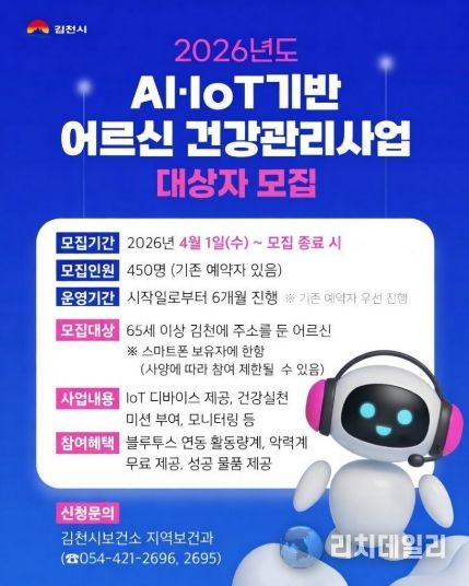 리치데일리 김상현 기자 | 김천시보건소에서는 오는 4월 1일부터 2026년도 AI∙IoT기반 어르신 건강관리사업에 신규 참여할 450명을 모집한다고 밝혔다.