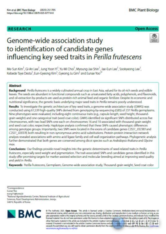 이번 연구 결과는 국제학술지 ‘BMC Plant Biology’(IF 4.8)에 논문으로 게재됐다. 앞으로 고품질 들깨 품종과 기능성 자원 개발, 분자표지 개발 등에 활용될 것으로 기대된다.