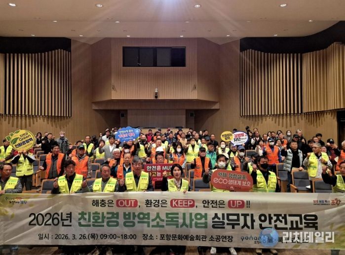 리치데일리 김상현 기자 | 포항시 남·북구보건소는 실질적인 안전 방역 활동과 안전보건 자율 이행을 위해 지난 26일 문화예술회관에서 ‘2026년 친환경 방역소독사업 안전교육’을 실시했다.