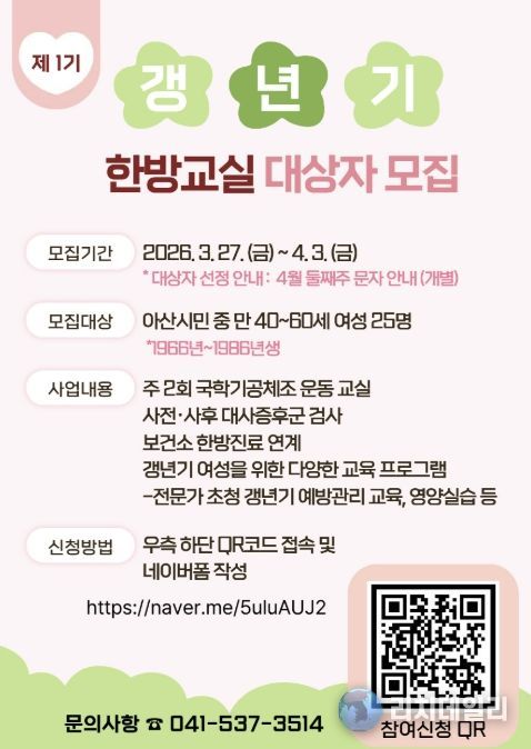 리치데일리 김상현 기자 | 아산시보건소에서 갱년기 예방 및 건강관리를 지원하기 위해 ‘제1기 갱년기 생기가득 한방교실’ 참여자를 3월 27일부터 4월 3일까지 모집한다.