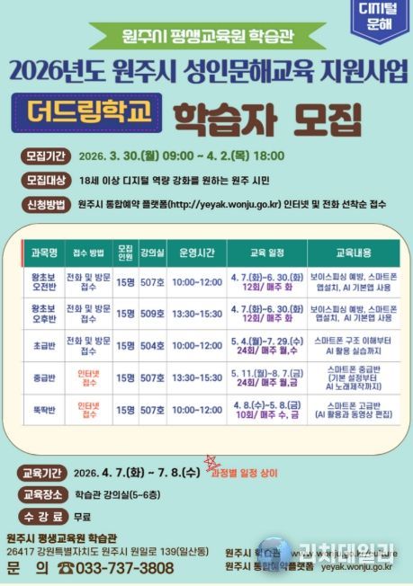 리치데일리 김상현 기자 | 원주시 평생교육원 학습관은 시민의 디지털 활용 역량 향상과 디지털 격차 해소를 위해 ‘2026년 더드림학교 더터치반(디지털 문해교육)’을 확대 운영한다.