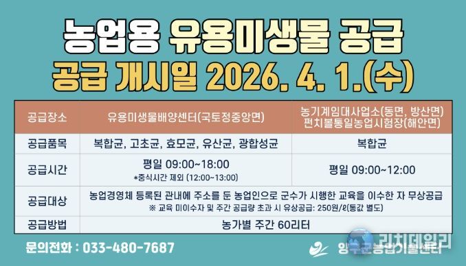 이번 무상 공급은 고초균, 유산균, 효모균, 광합성균, 복합균 등 총 5개 품목으로 유용미생물배양센터와 동면·방산면 농기계임대사업소, 해안면 펀치볼통일농업시험장 등 4개소에서 제공된다.