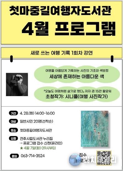 리치데일리 김상현 기자 | 전주시 첫마중길여행자도서관은 오는 4월 28일 ‘새로 쓰는 여행 기록’을 주제로 인플루언서인 시니플 여행작가 초청 강연을 개최한다.