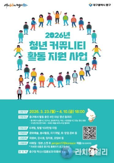 리치데일리 김상현 기자 | 대구 중구는 지역 청년들의 자발적인 모임과 창의적인 활동을 지원하기 위해 ‘2026년 청년 커뮤니티 활동 지원 사업’을 추진한다.