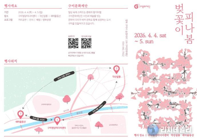 리치데일리 김상현 기자 | 구미문화재단은 벚꽃 만개 시기에 맞춰 오는 4월 4일 부터 5일까지 양일간 구미영상미디어센터와 각산살롱, 새마을동산 일원에서 봄맞이 특별기획 행사'벚꽃이 피나봄'을 개최한다.