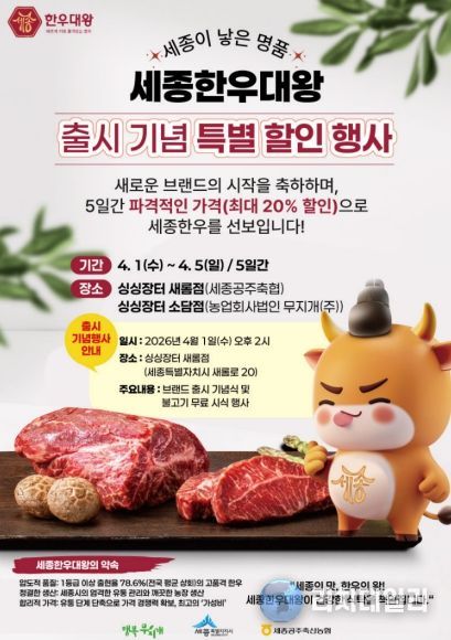 세종특별자치시는 4월 1일 세종한우대왕 공식 출시를 맞아 싱싱장터 새롬점(새롬로20)에서 기념행사를 개최한다.