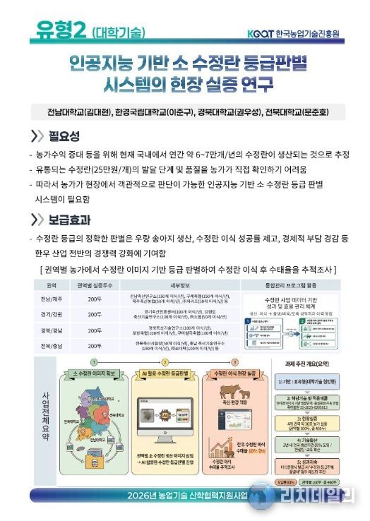 각 대학은 권역별 실증 연구를 수행하며, AI 기반 수정란 등급판별 기술의 현장 적용성을 높이고 한우 산업의 경쟁력 강화를 도모할 예정이다.