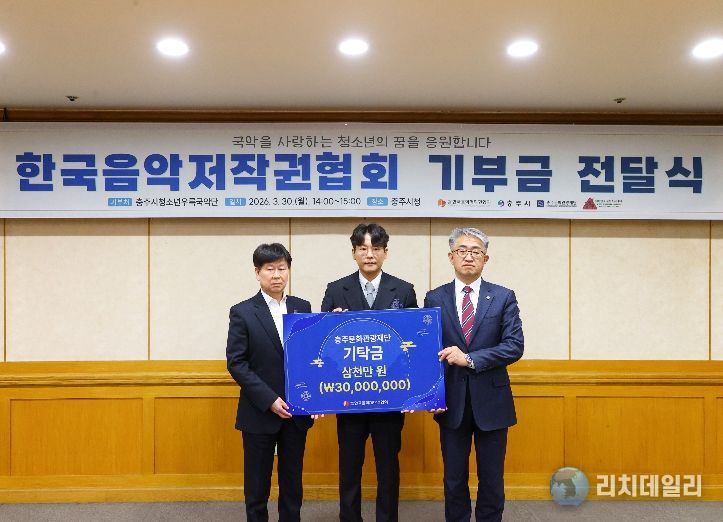 리치데일리 김상현 기자 | (사)한국음악저작권협회는 30일 충주시청을 방문해 지역 국악 인재 양성과 문화예술 교육 활성화를 위한 기부금 3,000만 원을 기탁했다.