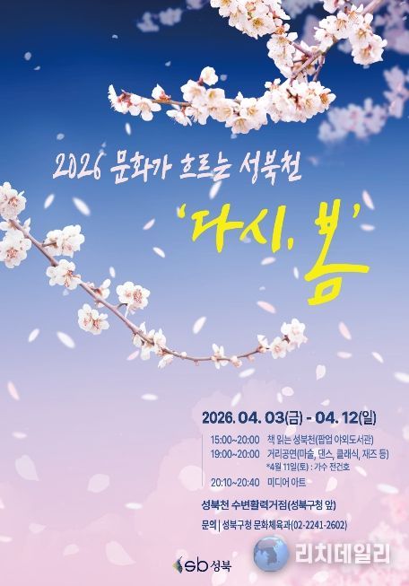 리치데일리 김상현 기자 | 서울 성북구가 주민참여형 복합문화행사인 문화가 흐르는 성북천 '다시, 봄'과 팝업 야외도서관 '책읽는 성북천'을 오는 4월 3일부터 12일까지 10일간 성북구청 앞 성북천 수변활력거점 일대에서 운영한다.