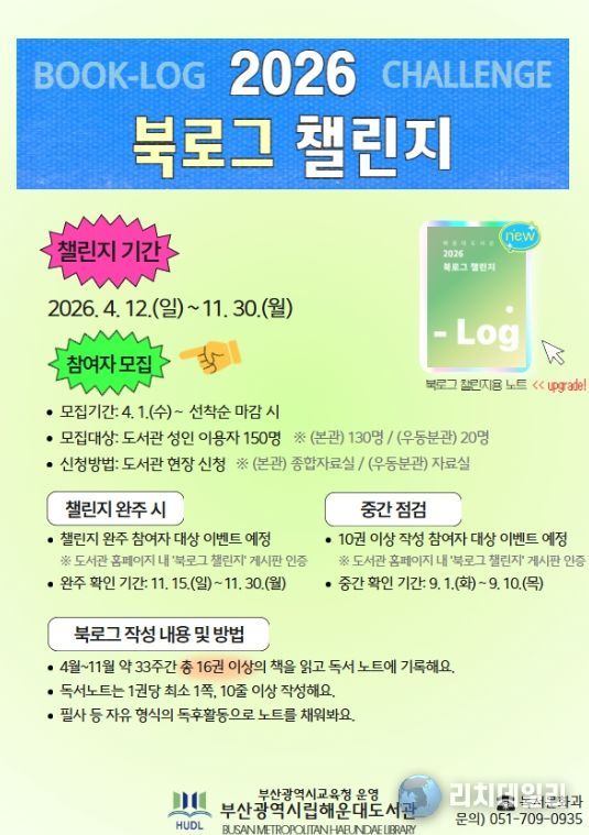 리치데일리 김상현 기자 | 부산광역시립해운대도서관(관장 노장석)은 오는 12일부터 11월 30일까지 성인 이용자 150명을 대상으로 ‘2026 북로그(Book-log) 챌린지’를 운영한다.