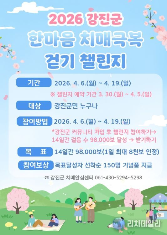리치데일리 김상현 기자 | 강진군 보건소(치매안심센터)가 치매예방에 대한 관심을 높이고 건강 생활 실천을 독려하기 위해 오는 4월 6일부터 19일까지 14일간 '한마음 치매극복 걷기챌린지'를 운영한다.