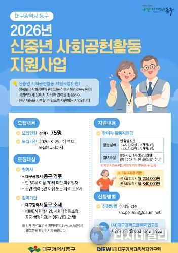 리치데일리 김상현 기자 | 대구 동구청은 퇴직 전문 인력의 경험과 전문성을 활용해 지역사회에 기여 하는 ‘2026년도 신중년 사회공헌활동 지원사업’을 시행한다.