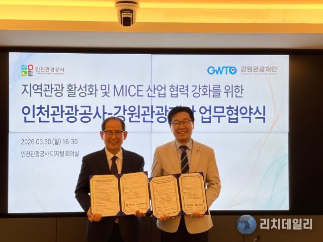 리치데일리 김상현 기자 | 인천관광공사는 강원관광재단(대표 최성현)과 30일 인천관광공사 회의실에서 ‘관광 및 마이스 산업 활성화와 지역 상생 협력강화를 위한 업무협약’을 체결하고 협력 체계를 강화한다고 밝혔다.