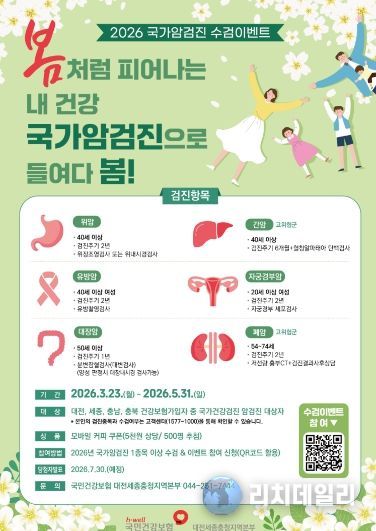 이번 이벤트는 2026년 3월 23일부터 5월 31일까지 진행되며, 대전·세종·충청지역 건강보험 가입자 가운데 국가암검진 대상자가 기간 내 검진을 받은 뒤 QR코드를 통해 참여를 신청하면 추첨을 통해 5천원 상당의 모바일 커피 쿠폰이 제공된다.