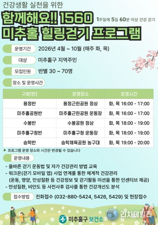 리치데일리 김상현 기자 | 인천 미추홀구는 지역 주민의 신체활동 실천율을 높이고 비만 등 만성질환을 예방하기 위해 ‘2026년 함께해요! 1560 미추홀 힐링 걷기’를 오는 4월부터 본격 운영한다고 밝혔다.