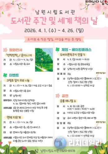 리치데일리 김상현 기자 | 남원시공공도서관(어울림・시립・어린이청소년도서관)에서 ‘제62회 도서관주간’과 ‘세계 책의 날’을 맞아 오는 4월 1일부터 26일까지 공연, 체험, 전시 등 시민들을 위한 다채로운 문화 프로그램을 운영한다.