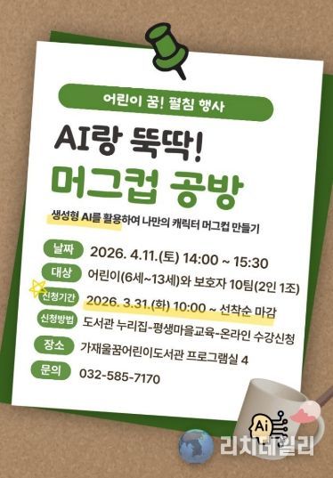 리치데일리 김상현 기자 | 인천광역시교육청서구도서관은 오는 4월, 어린이를 동반한 가족이 참여하는 생성형 AI를 활용한 특별 프로그램 ‘AI랑 뚝딱! 머그컵 공방’을 운영한다.