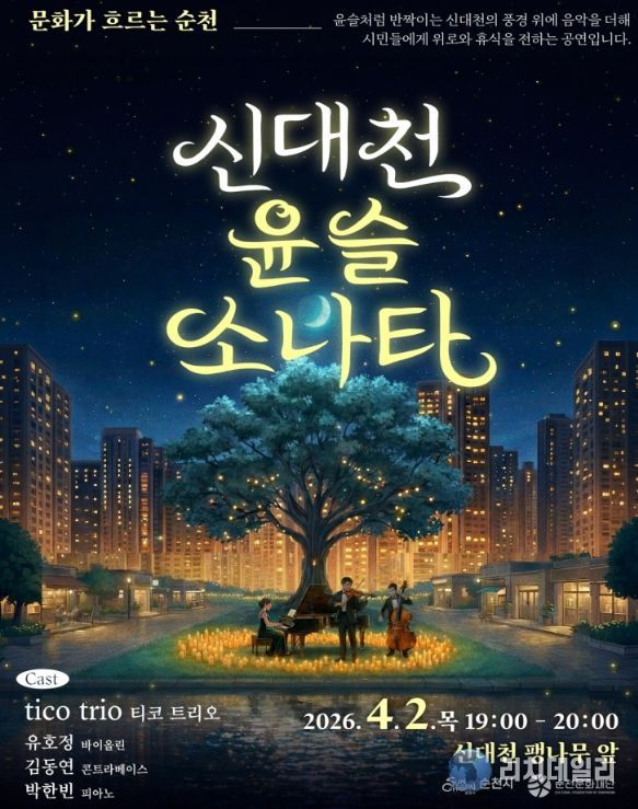 리치데일리 김상현 기자 | 재단법인 순천문화재단은 오는 4월 2일 목요일, 저녁 7시부터 한 시간 동안 신대천 팽나무 앞에서 고품격 야간 클래식 공연 '신대천, 윤슬소나타'를 개최한다고 밝혔다.