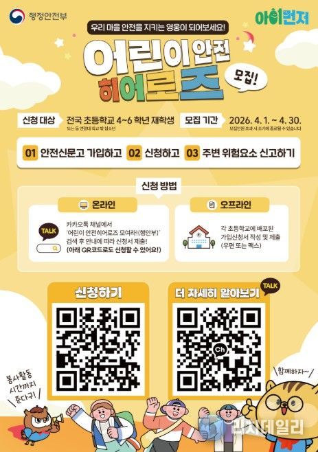 리치데일리 김상현 기자 | 행정안전부는 4월 1일부터 30일까지 ‘어린이 안전히어로즈’ 신규 대원을 모집한다.