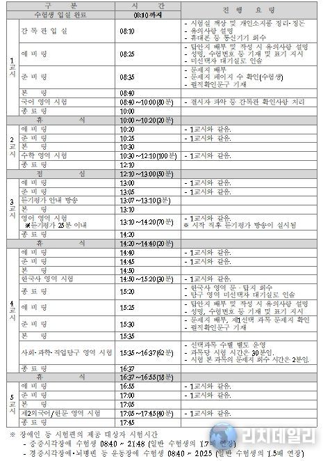 12. 장애인 권익 보호 및 편의 증진을 위하여 점자문제지가 필요한 시각장애 수험생 중 희망자에게는 화면낭독프로그램이 설치된 컴퓨터와 해당 프로그램용 문제지 파일을 제공하고, 이에 더하여 2교시 수학 영역 및 4교시 탐구 영역에서 필산기능을 활용할 수 있는 점자정보단말기를 제공한다.