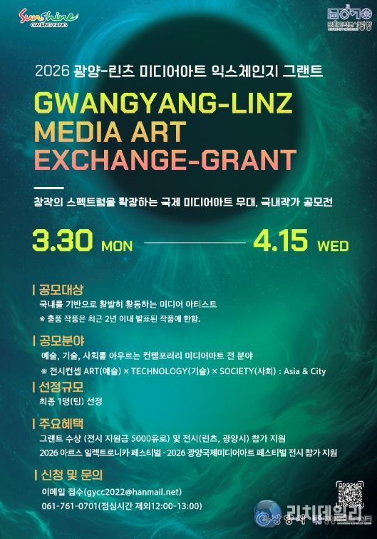 리치데일리 김상현 기자 | 광양문화도시센터는 오스트리아 린츠와의 예술 교류를 확대하고 국내 미디어아트의 국제 경쟁력을 높이기 위해 '광양-린츠 미디어아트 익스체인지 그랜트(Exchange-Grant)'에 참여할 국내 작가를 공개 모집한다.