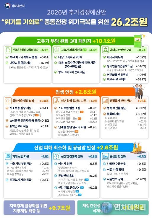 금번 추경예산안은 총 26.2조원 규모로 국민의 고유가 부담 완화 10.1조원, 민생 안정 지원 2.8조원, 산업 피해 최소화 및 공급망 안정 2.6조원, 지방재정 보강 등 9.7조원, 국채상환 1.0조원으로 구성된다. 중동전쟁으로 직접적으로 타격을 받아 어려움을 겪는 민생 안정과 피해기업·산업 지원에 더하여 금번 위기를 기회로 활용하기 위한 에너지·신산업 전환 사업도 포함했다.