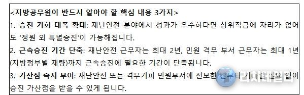 근속 승진 기회도 단축된다. 특히 재난안전 분야에서 2년 이상 근무한 공무원의 경우, 현재 1년까지 단축 가능한 근속승진 기간을 최대 2년까지 단축할 수 있도록 의무화했다.