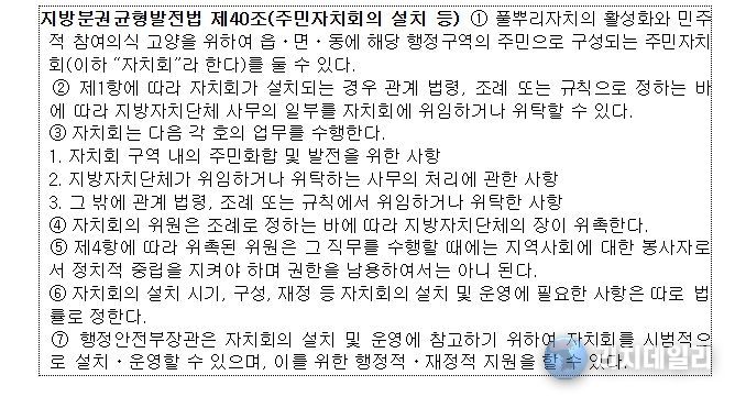 읍·면·동 주민으로 구성·운영되는 주민자치회는 「지방자치분권 및 지역균형발전에 관한 특별법」에 따라 시범 운영되고 있다.