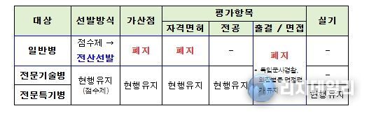 이는 군 복무에 전문성을 요하지 않는 일반병 입대를 위해 불필요한 자격증 취득 등 ‘과도한 스펙 경쟁’으로 이어져 병역이행을 준비하는 청년들의 사회적 ·경제적 비용을 과다 발생시키는 문제점이 있었다. 이를 개선하기 위해 병무청은 국방부 ·공군과 협의를 거쳐 자격 ·면허 ·전공과 상관없이 누구나 지원이 가능한 공군 일반병을 블라인드 방식의 무작위 선발로 변경한다. 다만, 공군 전문기술병과 전문특기병은 군 임무 특수성과 전문성 등을 감안하여 현행대로 점수제 선발 방식을 유지하기로 했다.