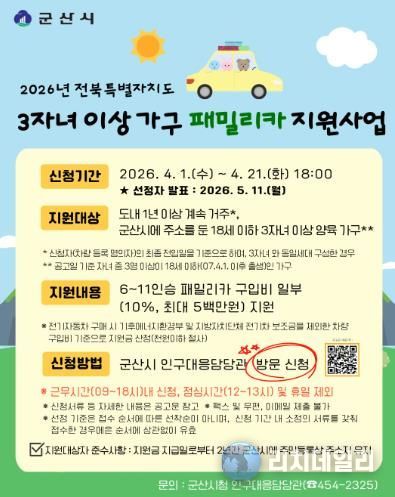 리치데일리 김상현 기자 | 군산시는 다자녀 가구의 경제적 부담을 완화하고 이동 편의를 제공하여 저출생 위기를 극복하고자 ‘2026년 전북특별자치도 3자녀 이상 가구 패밀리카 지원사업’ 참여자를 모집한다고 밝혔다.