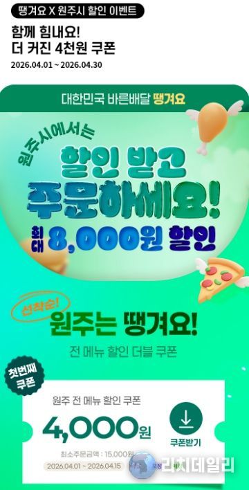 리치데일리 김상현 기자 | 원주시는 4월부터 상생배달앱 ‘땡겨요’ 할인쿠폰 지원을 확대한다.