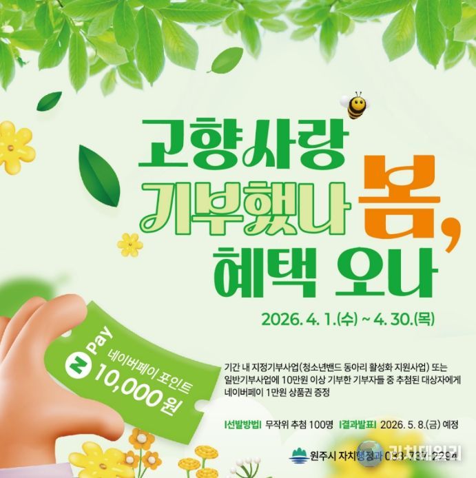 이번 이벤트는 4월 1일부터 30일까지 한 달간 진행된다. 해당 기간 원주시에 10만 원 이상 기부한 기부자를 대상으로, 추첨을 통해 100명에게 네이버페이 1만 원권을 증정할 예정이다. 추첨 결과는 5월 8일 당첨자에게 개별 안내할 예정이다.
