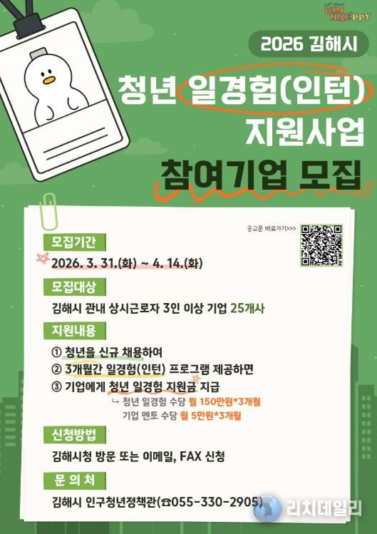 참여기업 모집 기간은 오는 14일까지이며, 신청을 희망하는 기업은 김해시청 인구청년정책관을 방문하거나 이메일 또는 팩스로 접수하면 된다. 자세한 사항은 김해시청 누리집 공고문에서 확인할 수 있다.