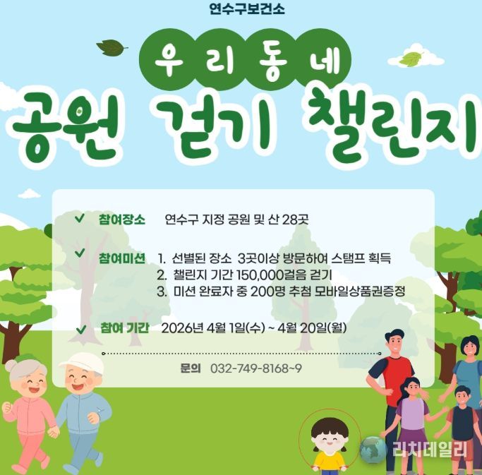 리치데일리 김상현 기자 | 연수구보건소는 구민의 건강 증진과 일상 속 걷기 실천 확산을 위해 ‘2026 우리동네 공원 스탬프투어’를 이달 20일까지 운영한다.