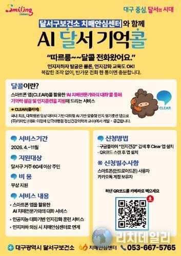 이태훈 달서구청장은 “AI 기술을 활용한 ‘달서 기억콜’은 어르신들이 보다 쉽고 편리하게 치매 예방 서비스를 이용할 수 있도록 한 새로운 시도”라며 “앞으로도 어르신들이 살던 곳에서 건강하고 행복한 노후를 보낼 수 있도록 다양한 서비스를 지속적으로 확대해 나가겠다”고 말했다.