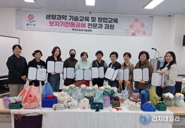 리치데일리 김상현 기자 | 부안군농업기술센터는 2026년 상반기 생활과학기술교육의 일환으로 운영한 보자기전통공예전문가 자격과정을 성공적으로 마무리하고 지난달 31일 성과전시회와 함께 수료식을 실시했다고 밝혔다.