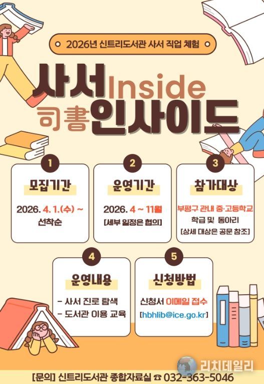 리치데일리 김상현 기자 | 인천광역시교육청신트리도서관은 오는 4월 1일부터 부평구 관내 중·고등학교를 대상으로 사서 진로 체험 프로그램 ‘사서 인사이드’에 참여할 기관을 모집한다.