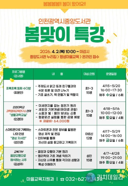 리치데일리 김상현 기자 | 인천광역시교육청중앙도서관은 4월부터 지역주민의 배움과 여가를 지원하기 위하여, 다양한 연령층을 대상으로 ‘봄맞이 특강’을 운영한다.