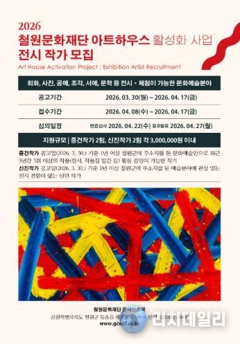 리치데일리 김상현 기자 | (재)철원문화재단은 2026년 아트하우스 전시에 참여할 작가를 오는 4월 8일부터 17일까지 공개 모집한다.