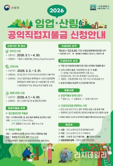 리치데일리 김상현 기자 | 울진군은 임업인의 소득 안정과 산림의 공익기능 증진을 위한 ‘2026년 임업·산림 공익직접지불금(이하 임업직불금)’방문 신청을 4월 1일부터 4월 30일까지 한 달간 접수한다.