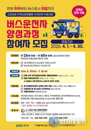 한편, 버스운전자 양성과정은 2026년 지역산업 맞춤형 자치단체 지원사업에 선정된 사업으로 (사)고양시기업‧경제인연합회가 수행하고 있다. 특히 2018년부터 공모사업에 9년 연속 선정돼 고양시 버스 운수업체의 운전기사 부족 문제를 해소하는 데 기여하고 있다.
