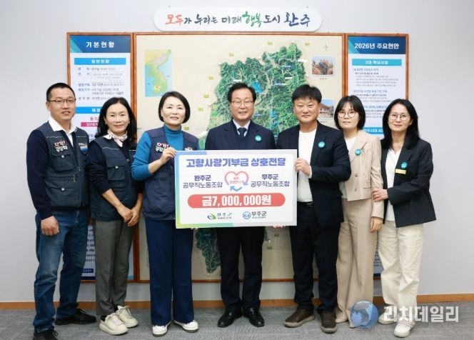 리치데일리 김상현 기자 | 완주군 공무직 노동조합(위원장 김상곤)과 무주군 공무직 노동조합(지부장 오순덕)이 서로의 지역 발전을 응원하며 고향 사랑 기부금을 상호 기부하는 뜻깊은 자리를 마련했다.