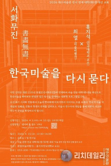 리치데일리 김상현 기자 | 대구문화예술진흥원 대구미술관은 개관 15주년 특별전 서화무진과 연계해 미술 전공 대학(원)생을 대상으로 한 교육 프로그램 ‘서화무진, 한국화를 다시 묻다’를 오는 4월 15일, 오후 12시 30분부터 4시까지 운영한다.