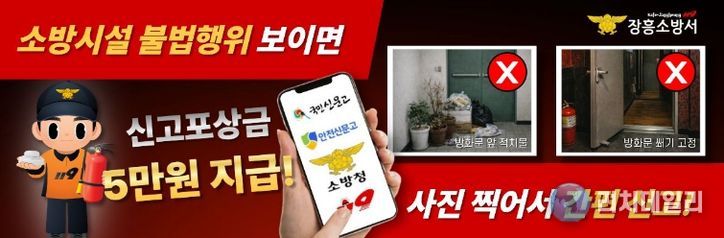 리치데일리 김상현 기자 | 장흥소방서(서장 문병운)는 군민 참여를 통한 화재 예방 강화를 위해 ‘소방시설 불법행위 신고포상제’를 연중 운영한다고 밝혔다.