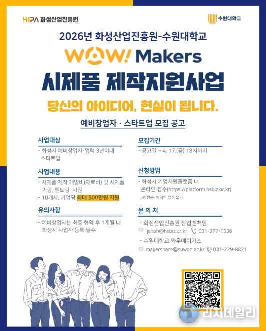 리치데일리 김상현 기자 | 화성산업진흥원(원장 전병선)과 수원대학교(총장 임경숙)가 협력하여 화성시 창업기업의 아이디어를 실물로 구현하는 ‘2026년 WoW! makers 시제품 제작 지원사업’을 추진한다.