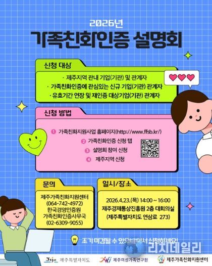 리치데일리 김상현 기자 | 제주특별자치도와 제주여성가족연구원 제주가족친화지원센터는 2026년 가족친화인증 신규 및 재인증 신청 접수에 따라 도내 기업(관)을 대상으로 가족친화인증 설명회를 개최한다.