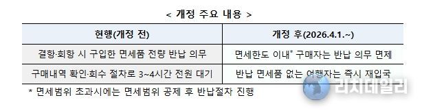 관세청은 지난 2월 말 면세품 회수 예외 근거가 「관세법 시행령」에 마련됨에 따라, 세부 이행 절차를 담은 「여행자 및 승무원 휴대품 통관에 관한 고시」 개정을 완료하고 4월 1일부터 본격 시행한다고 밝혔다.