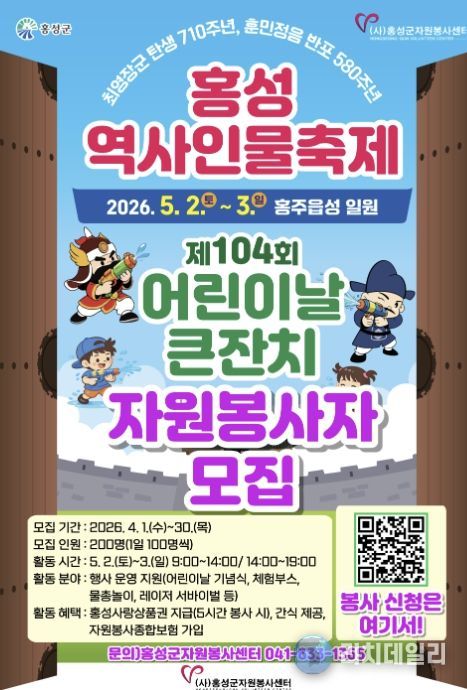 리치데일리 김상현 기자 | (사)홍성군자원봉사센터는 오는 5월 2일부터 3일까지, 이틀간 홍주읍성 일원에서 개최되는 ‘2026 홍성군역사인물축제 × 어린이날 큰 잔치’의 성공적인 운영을 위해 자원봉사자 200명을 모집한다고 밝혔다.