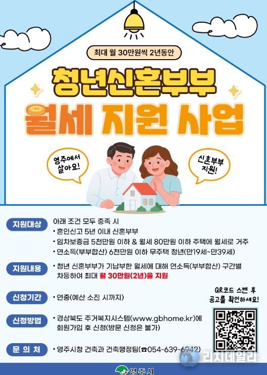 리치데일리 김상현 기자 | 영주시는 청년 신혼부부의 주거비 부담을 완화하기 위해 시행 중인 '청년 신혼부부 월세 지원사업'을 보다 널리 알리고자 홍보자료를 배부하는 등 적극적인 안내와 홍보를 추진하고 있다고 밝혔다.